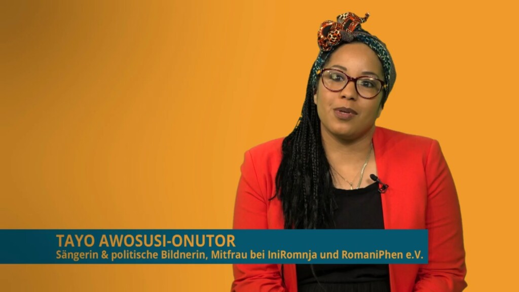 Tayo Awosusi Onutor bezeichnet sich selbst als Afro-Sintiza, arbeitet als Sänger:in und politische Bildner:in, des Weiteren ist sie Co-Begründer:in und Mitfrau der "IniRomnja" sowie des feministischen Wissensarchivs "RomaniPhen Verein".