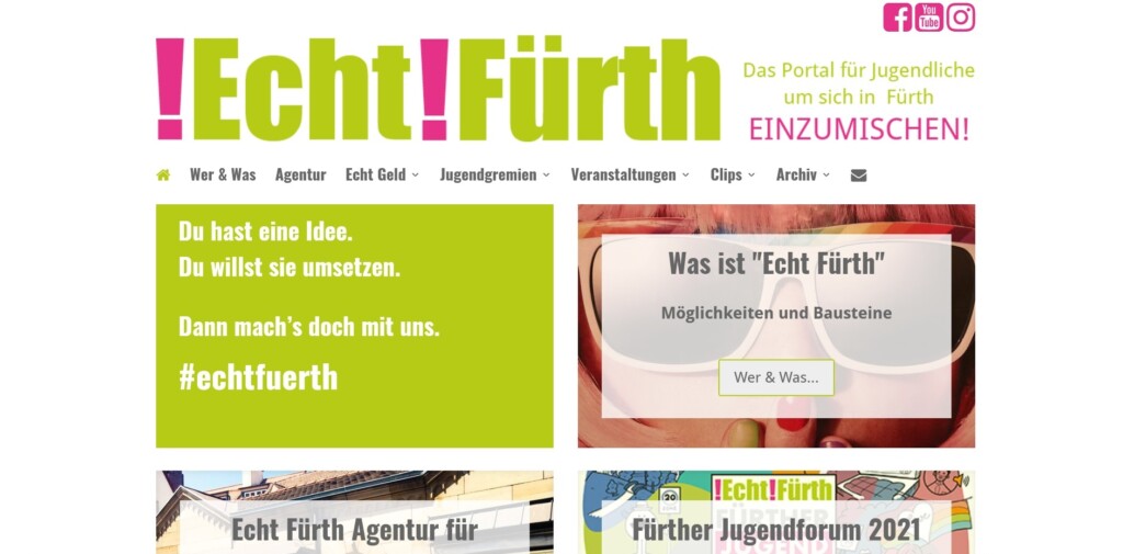 "Echt Fürth!" Das Portal für Jugendliche, um sich in Fürth einzumischen! Das Portal ist ein Projekt der Stadt Fürth mit dem Ziel, Jugendliche an der Kommunalpolitik zu beteiligen. Sie bekommen dadurch die Möglichkeit, Kommunalpolitiker:innen stärker auf ihre Interessen und Anliegen aufmerksam zu machen und damit verbunden Jugendpolitik in den Mittelpunkt der politischen Diskussionen zu stellen. "Echt Fürth" Das Portal für Jugendliche bringt somit Politik, Verwaltung und Jugendliche zusammen und unterstützt sie ihre Ideen zu verwirklichen.