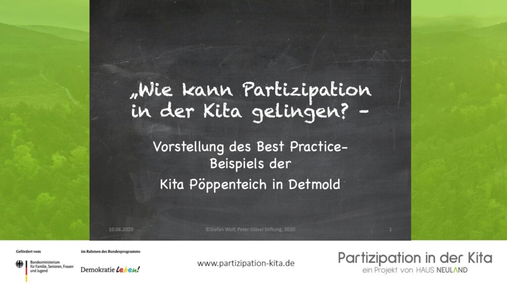 Stefan Wolf, Leiter:in der Peter-Gläsel-Stiftung in Detmold, erläutert in seinem:ihrem Vortrag Partizipation in der Kita. Die Kita Pöppenteich, deren Träger die Stiftung ist, hat im Jahr 2019 den Arbeitgeberpreis für Bildung gewonnen und wurde damit besonders für ihr partizipatives Konzept ausgezeichnet. Stefan Wolf stellt anhand dieser Kita vor, welche Herausforderungen und Chancen auf Kitas warten, die vermehrt partizipativ handeln wollen.